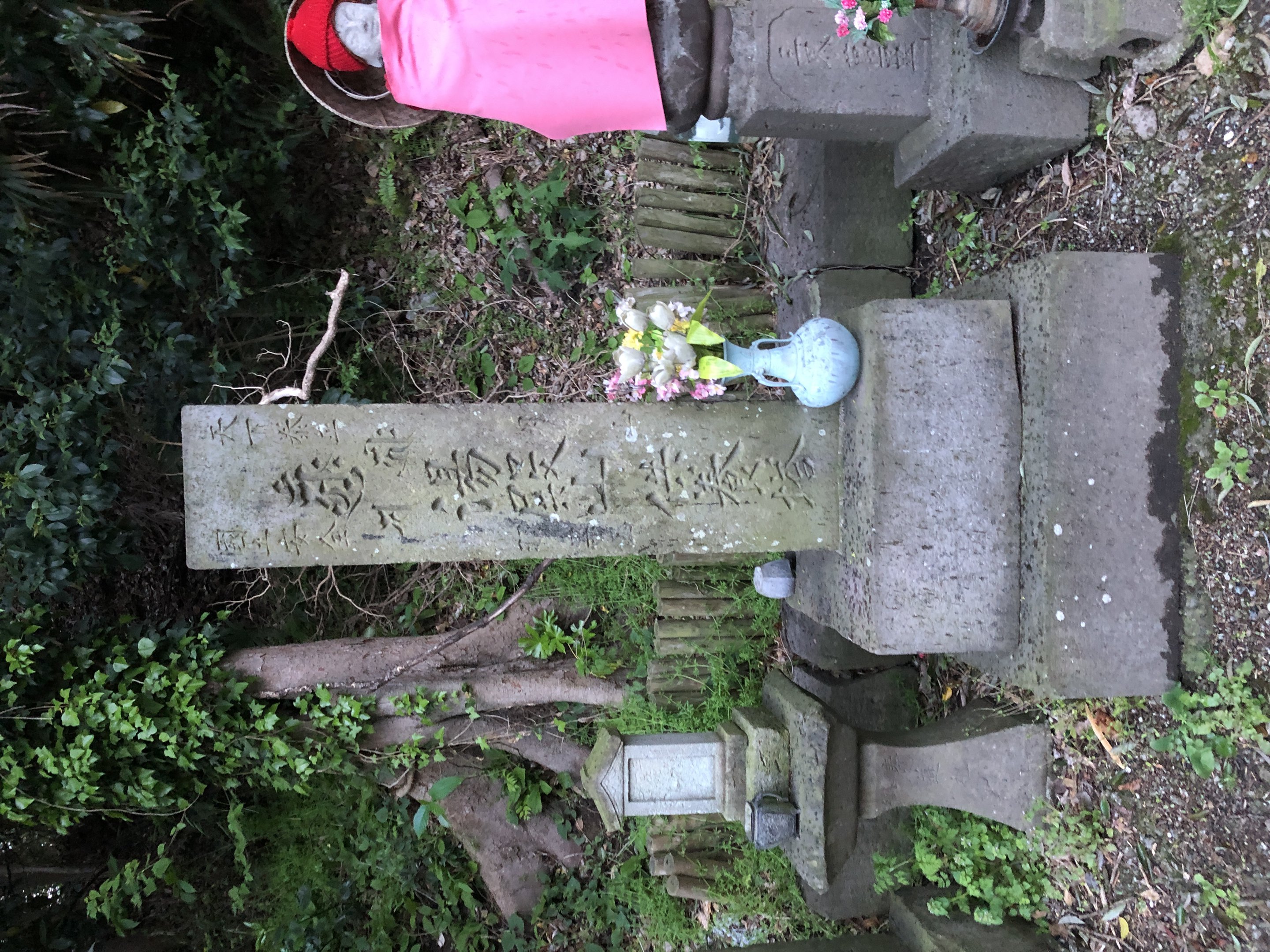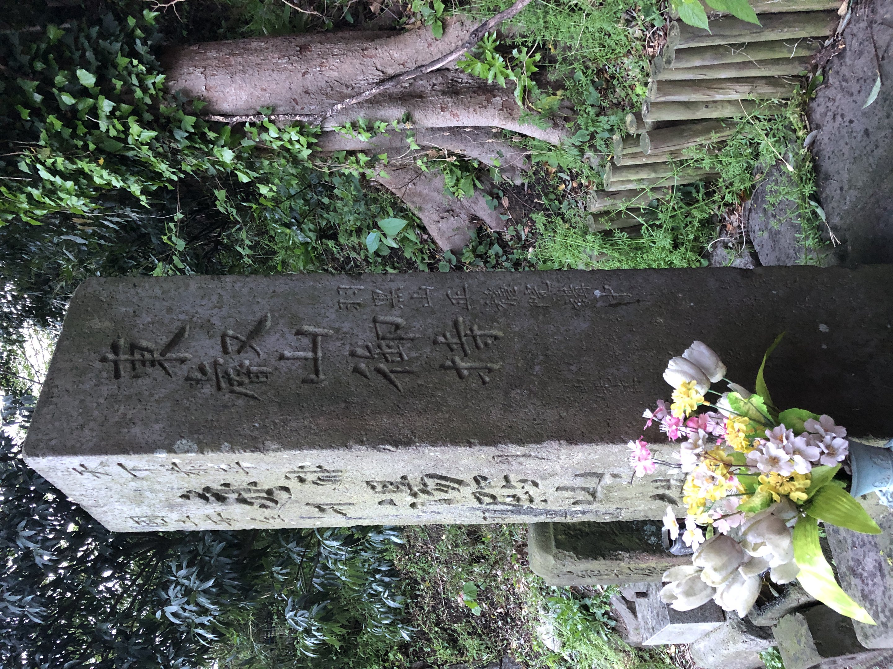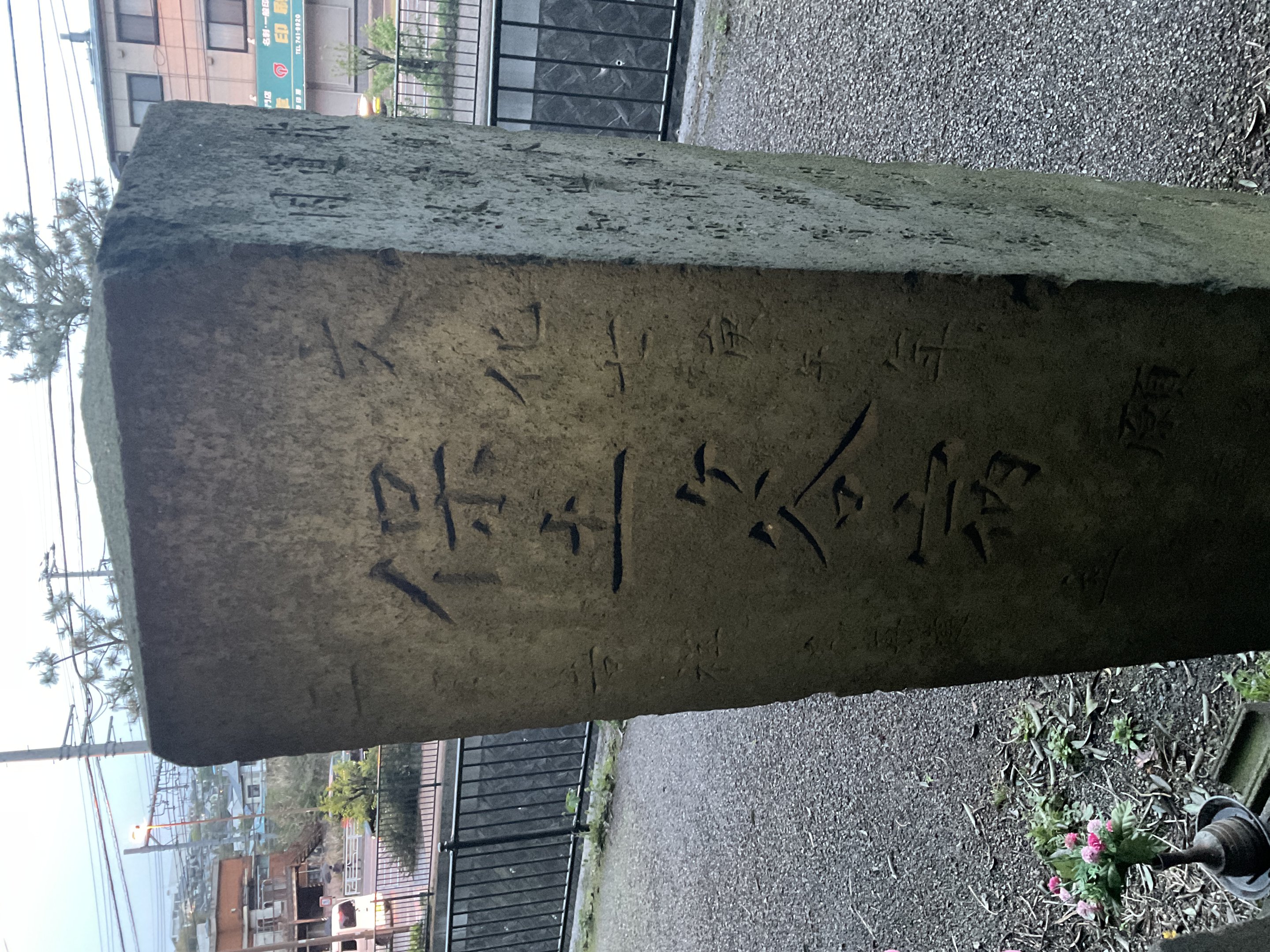 備考:東海道沿い保土ヶ谷宿上方見附跡、外川神社のある崖下。正面:天下泰平 國土安全 (アーンク)(キリーク)(サ)月山 湯殿山 羽黒山 供養塔、右側面:東叡山御持 羽黒山正穏院講中 山先達 長傅院 下部に複数の人名 院号、左側面:大日経一節「我覚本不生出過語言道諸過得解脱遠離於因縁知空等虚空」導師 □仙寺眞圭 敬白、裏面:文化七庚午年三月吉祥 再建 保土ヶ谷宿 願主 複数の人名、撮影:2023年4月9日