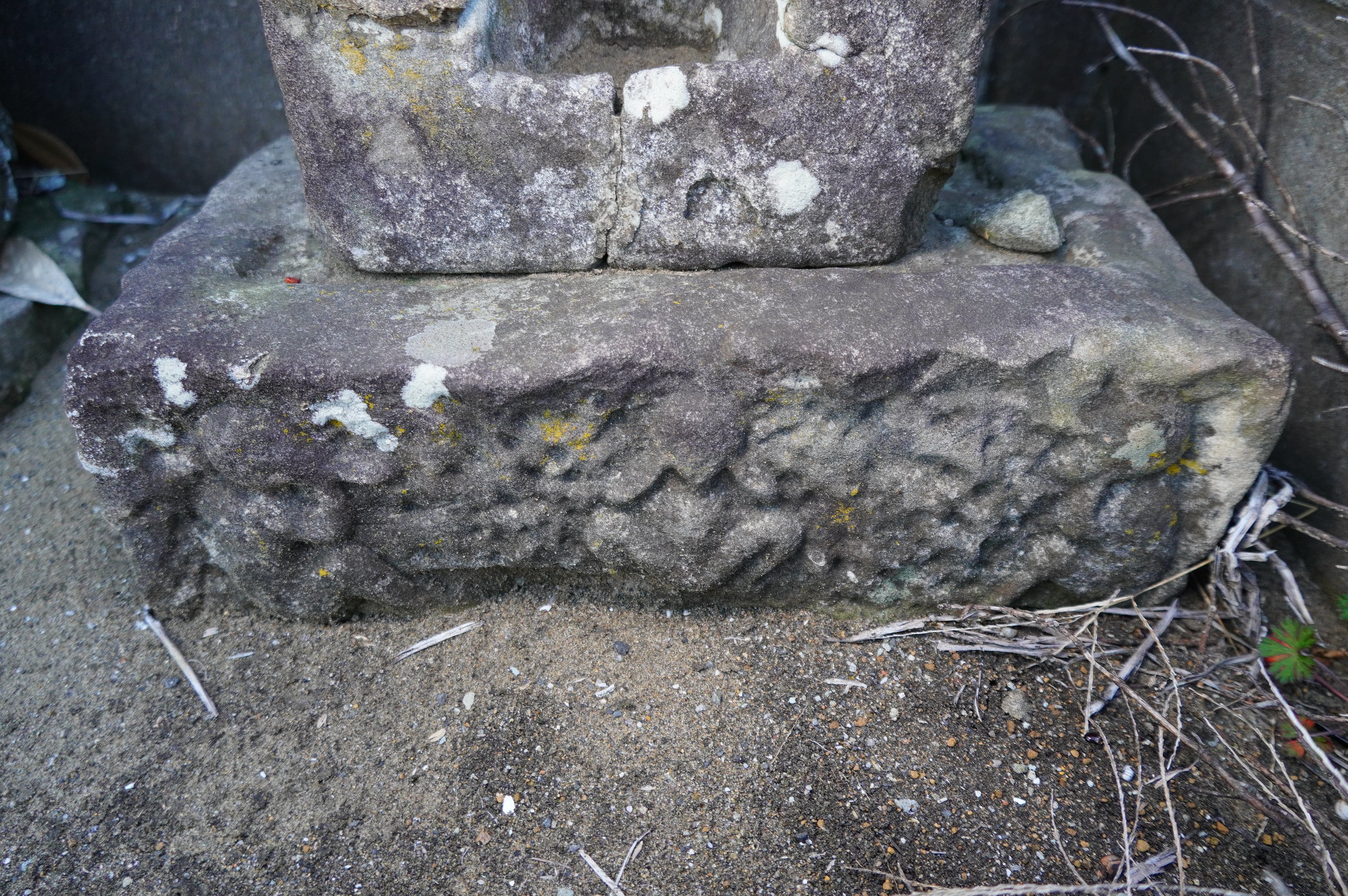 備考:すぐ隣の子安神石祠が置かれている三猿の土台はこの庚申塔のものか?
