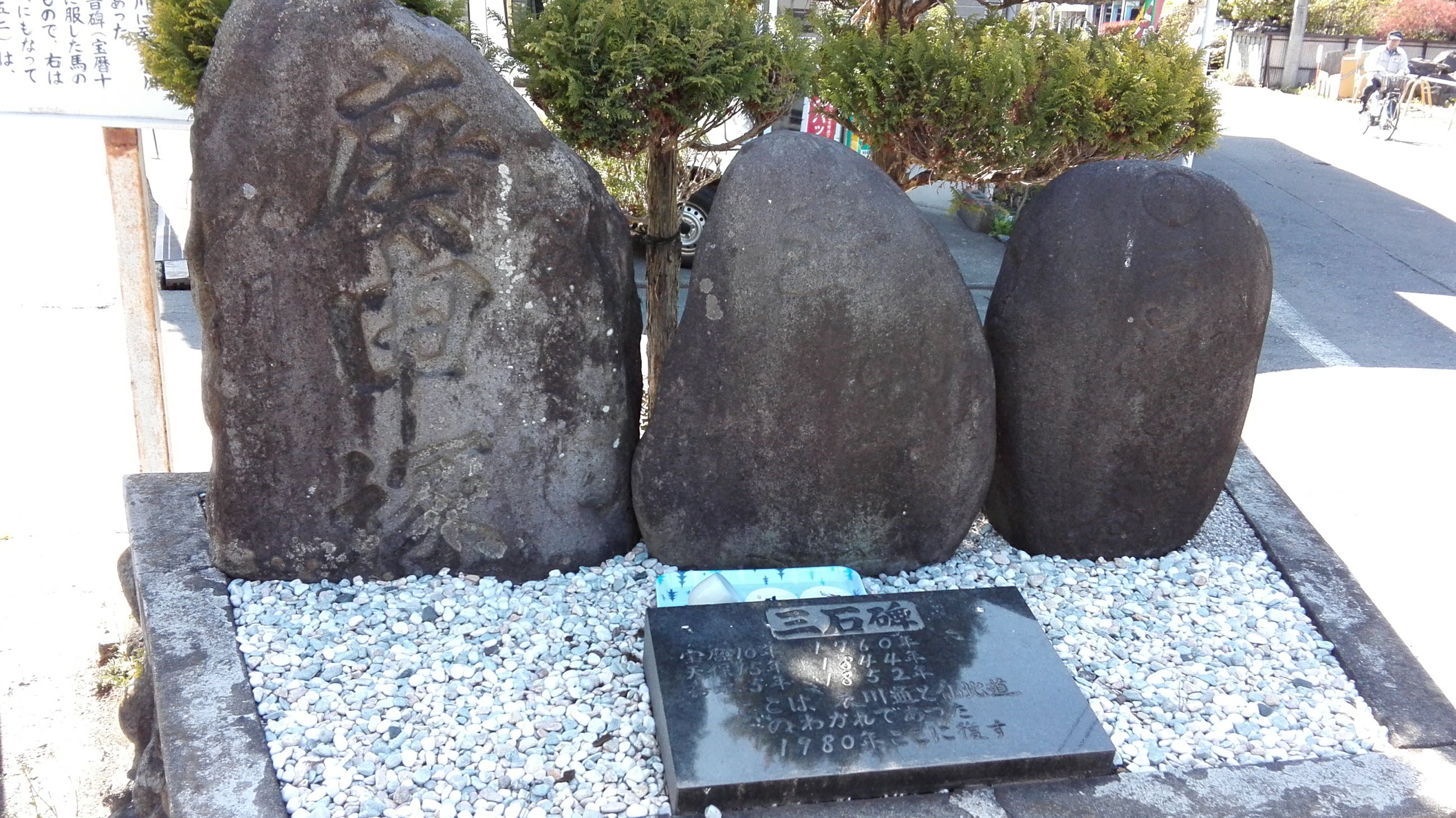 備考:右せんぼく、左けはひさかの彫りあり。3基のうち左が庚申塔、真ん中が五猿碑、右が馬頭観音碑兼道標。