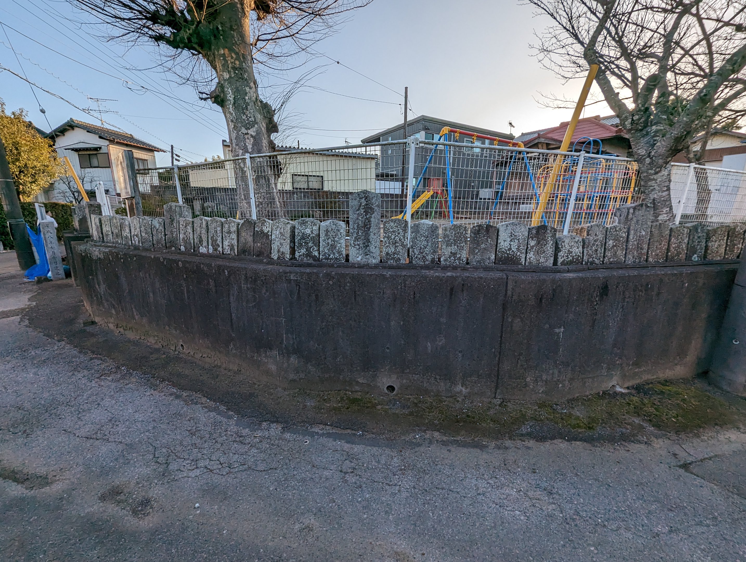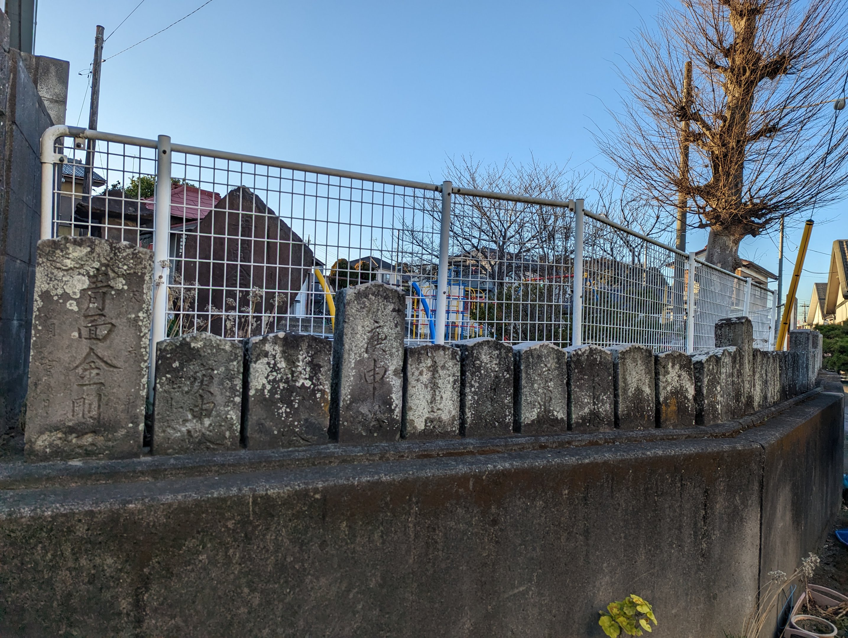 備考:百基の庚申文字塔が神社境界に並べられている。