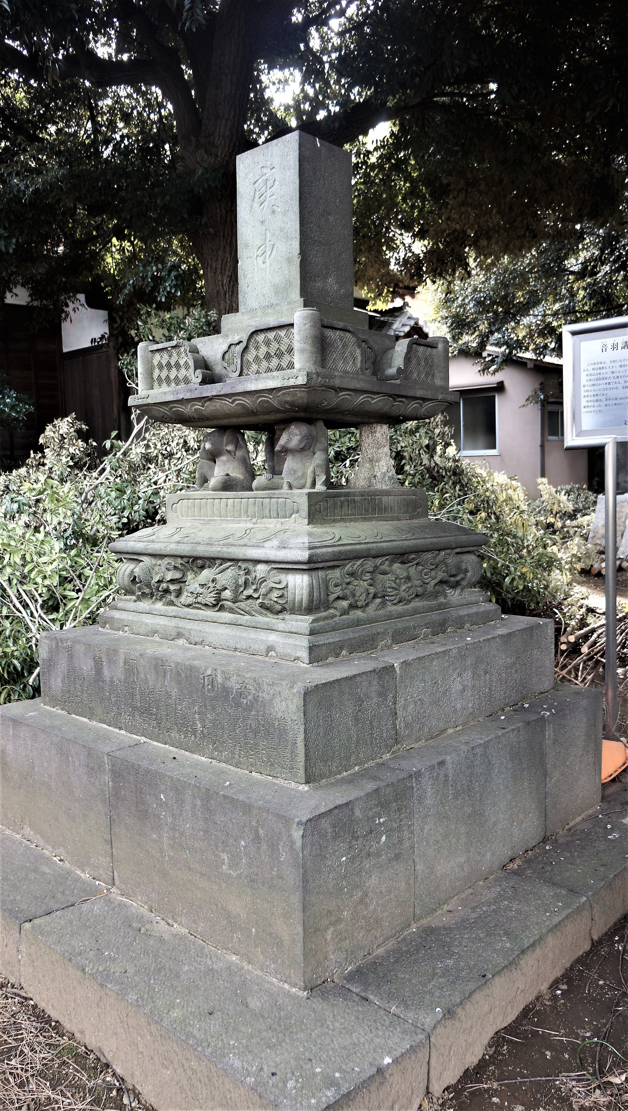 備考:雑型・独特の形 「庚申」 く台〉音羽下町講中,桑名屋善六,若狭屋吉兵衛,信濃屋茂八,大久保屋太兵衛,豊国屋丈七,武蔵屋鉄三郎,永楽屋長兵衛,福嶋屋与八ら世話人,吉野屋善兵衛,参河屋久兵衛,皆川屋文五郎,相模屋清治郎ら,く台右〉鈴木徳右衛門,栗山兵左衛門,小川屋勘兵衛,伊勢 屋彦右衛門ら,・・・多数、屋号と名