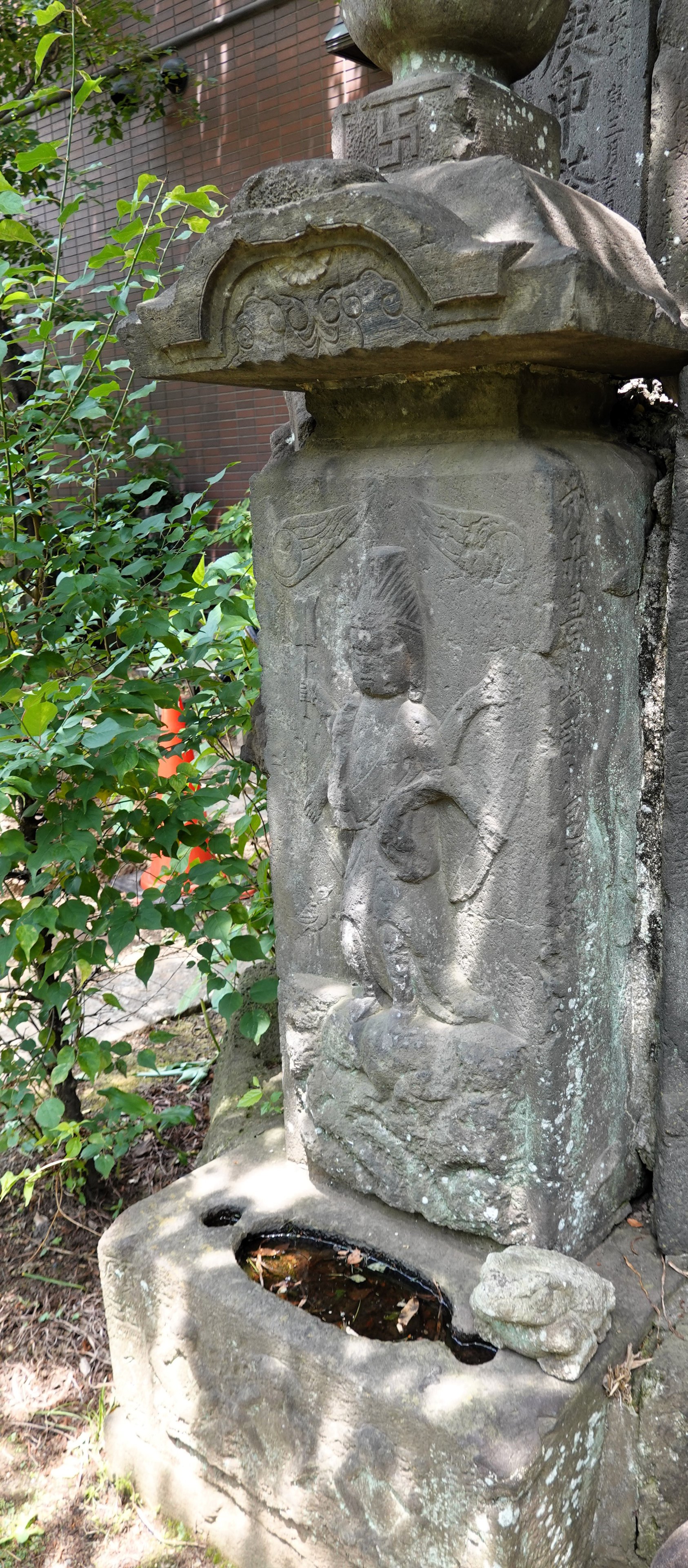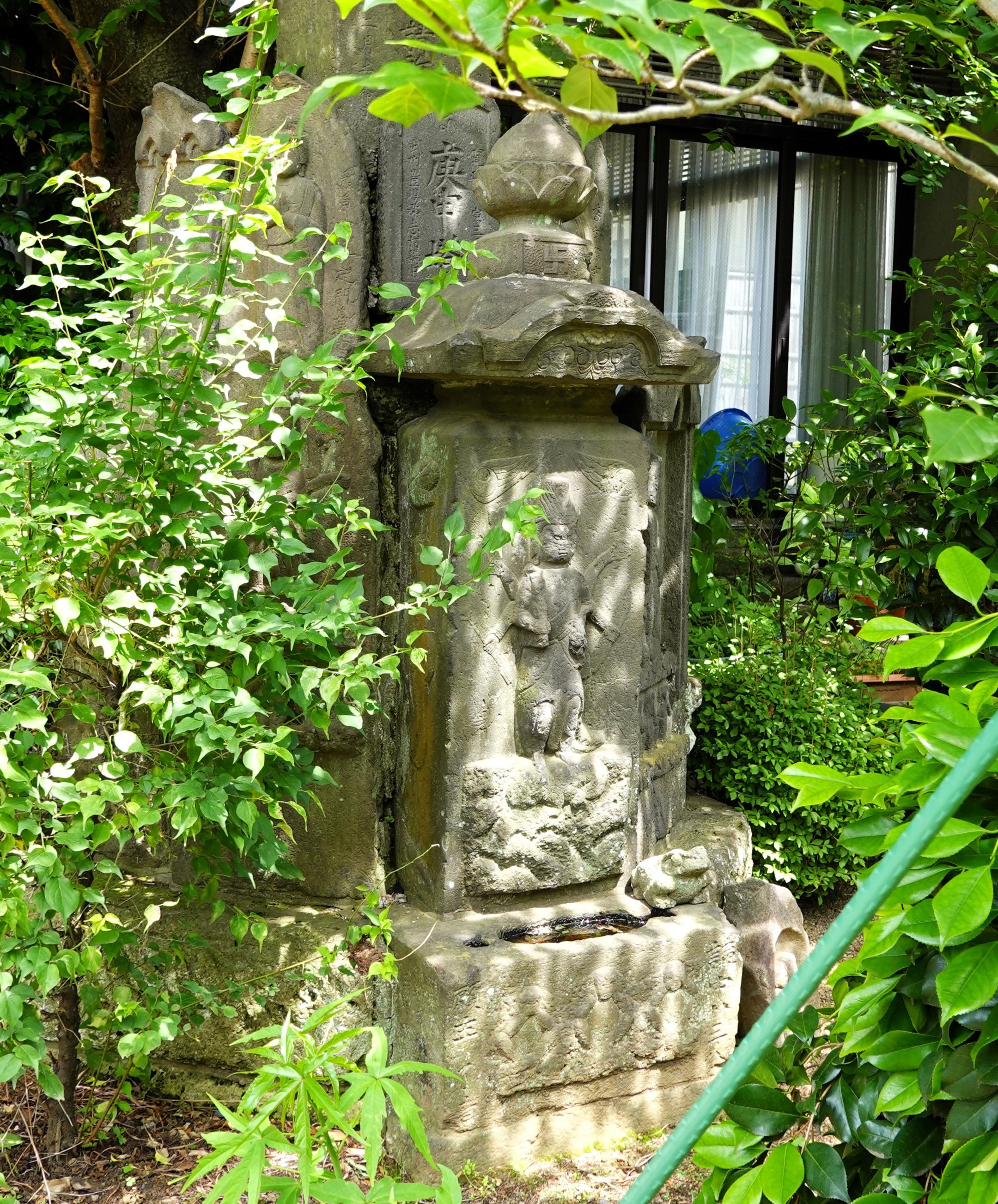 備考:笠付角柱型 武州豊嶋郡小豆沢村,講中廿三人,願主了音 平岩平蔵,初沼孫三郎,川端久左衛門ら 六臂 日月、邪鬼、ショケラ、二鶏、三猿