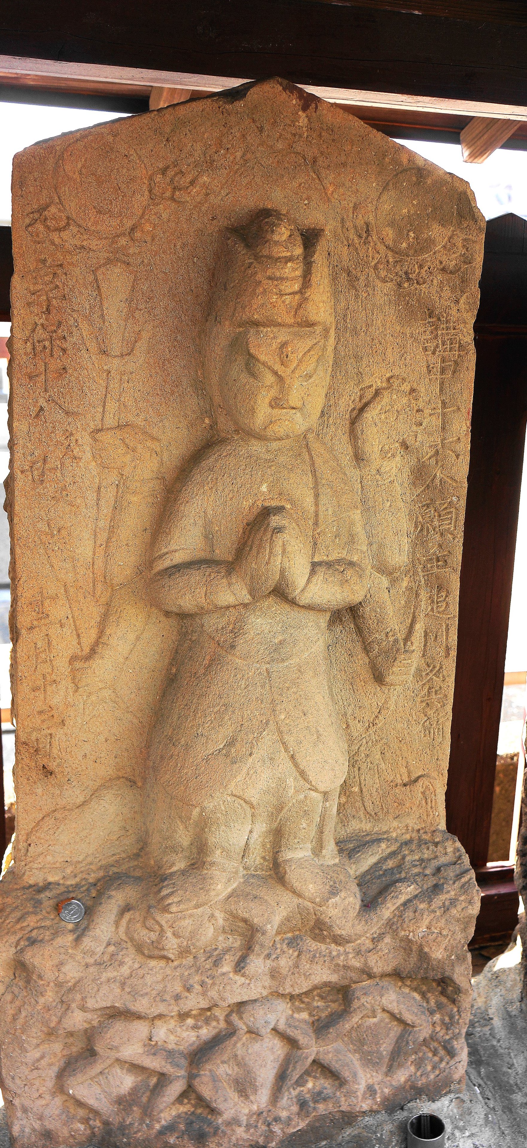 備考:駒型 武刕豊嶋郡徳丸中尾村 講中十六人 願主及川久兵衛 合掌六臂 二鶏、邪鬼、三猿