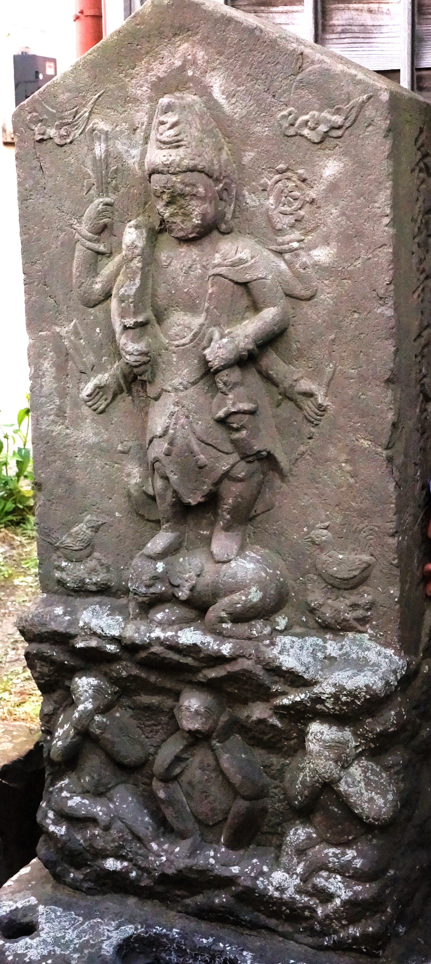 備考:駒型 青面金剛立像 六臂 日月・邪鬼・三猿・二鶏・ショケラ 奉納青面金剛童子 庚申講中