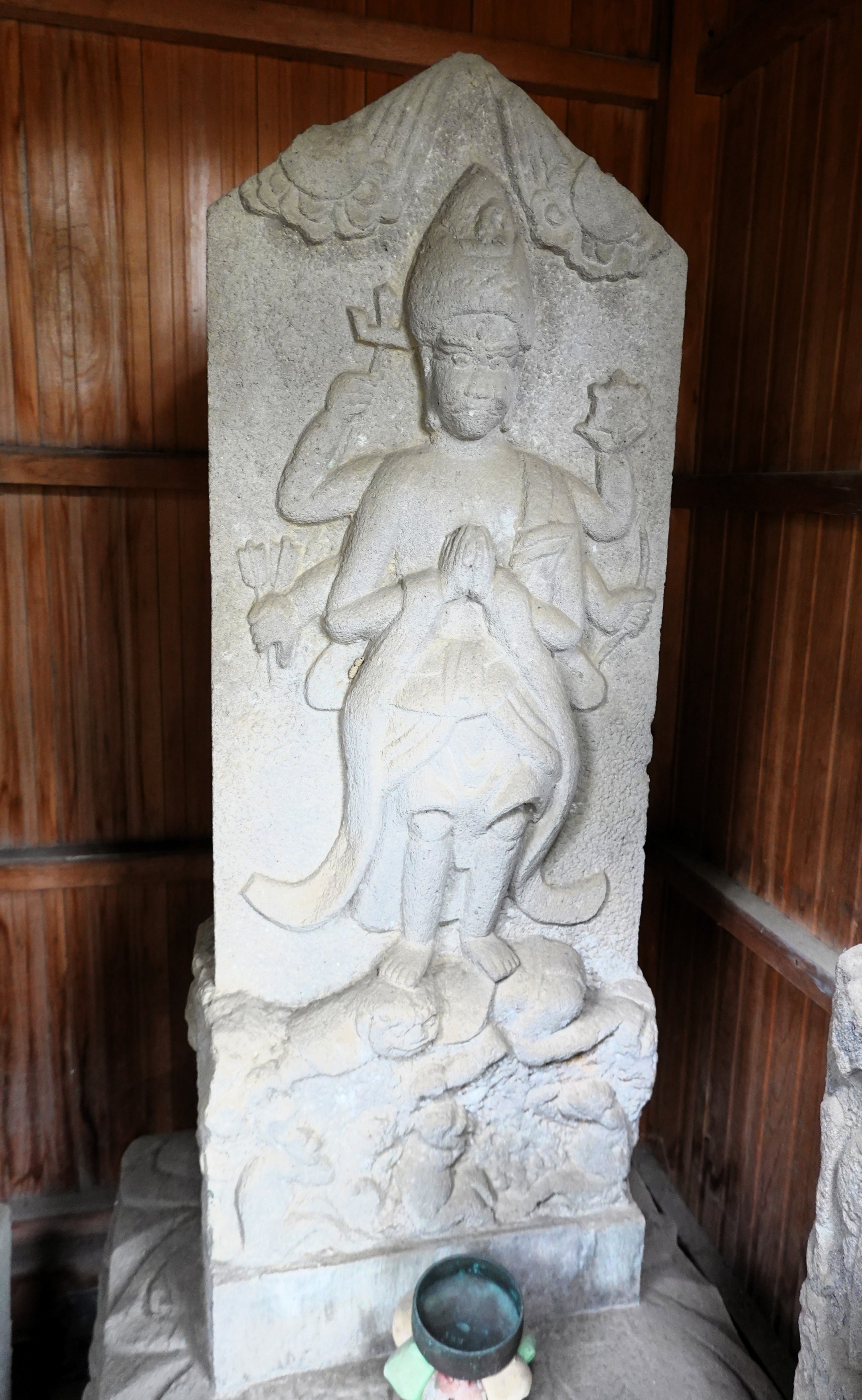 備考:駒型 青面金剛立像 合掌六臂 日月・邪鬼・三猿